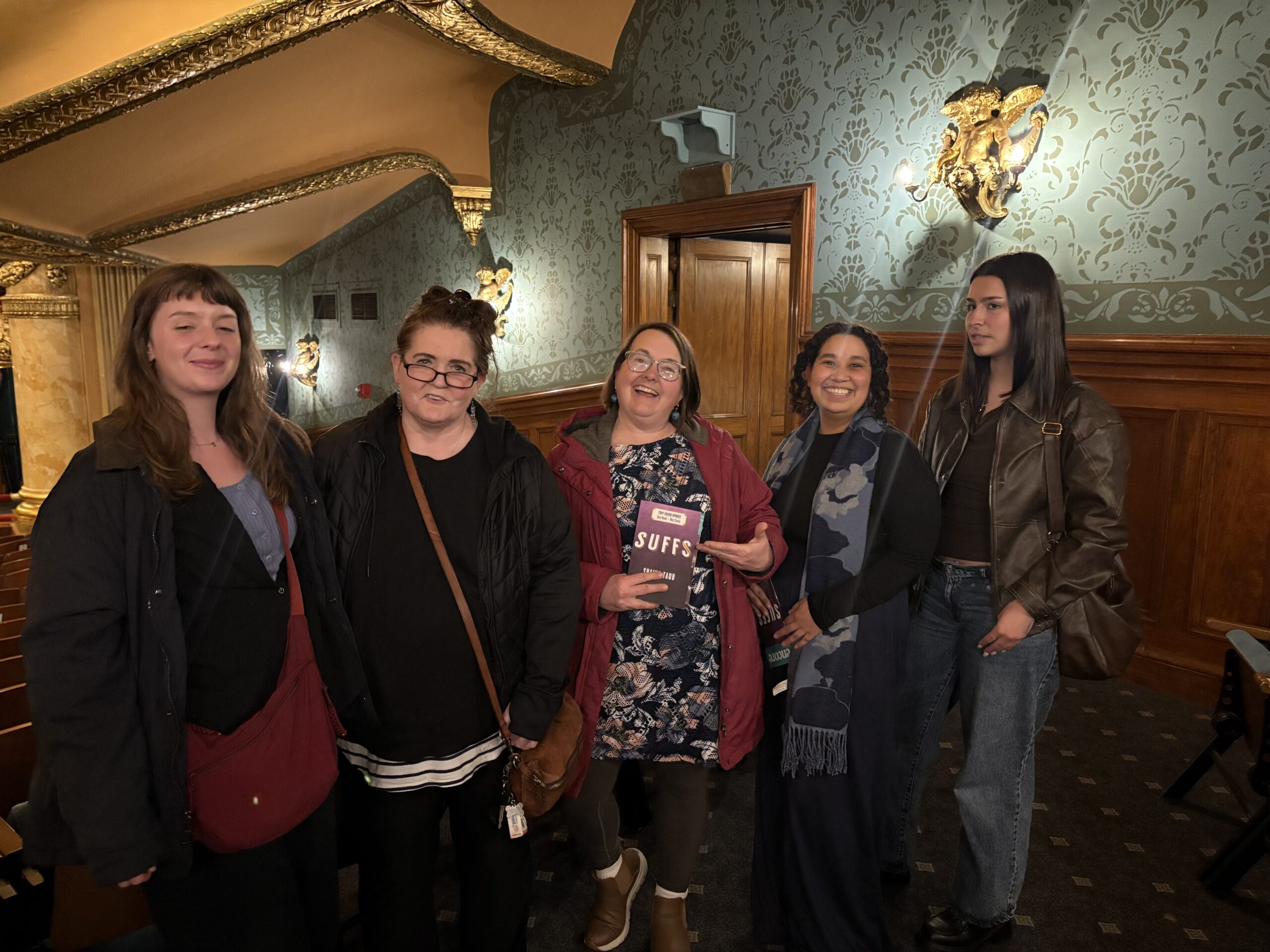 Professor Lisa Heller-Boragine's "Communicating in Current Settings" class at the Emerson Colonial Theatre (From left) Brianna Kauranen, Pamela Dee, Professor Lisa Heller-Boragine, Attaquis Pocknett-Lopes, and